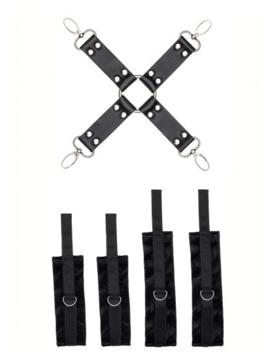 Hog tie cuff set from the our fetish series.Hogtie that binds your wrists and ankles from behind, leaving you open for all kinds of kinky play.The 4 cuffs for wrists and ankles are made of soft foam material for extra comfort and can be easily adjusted with the Velcro closure. They are attached to the straps with metal musketon hooks.