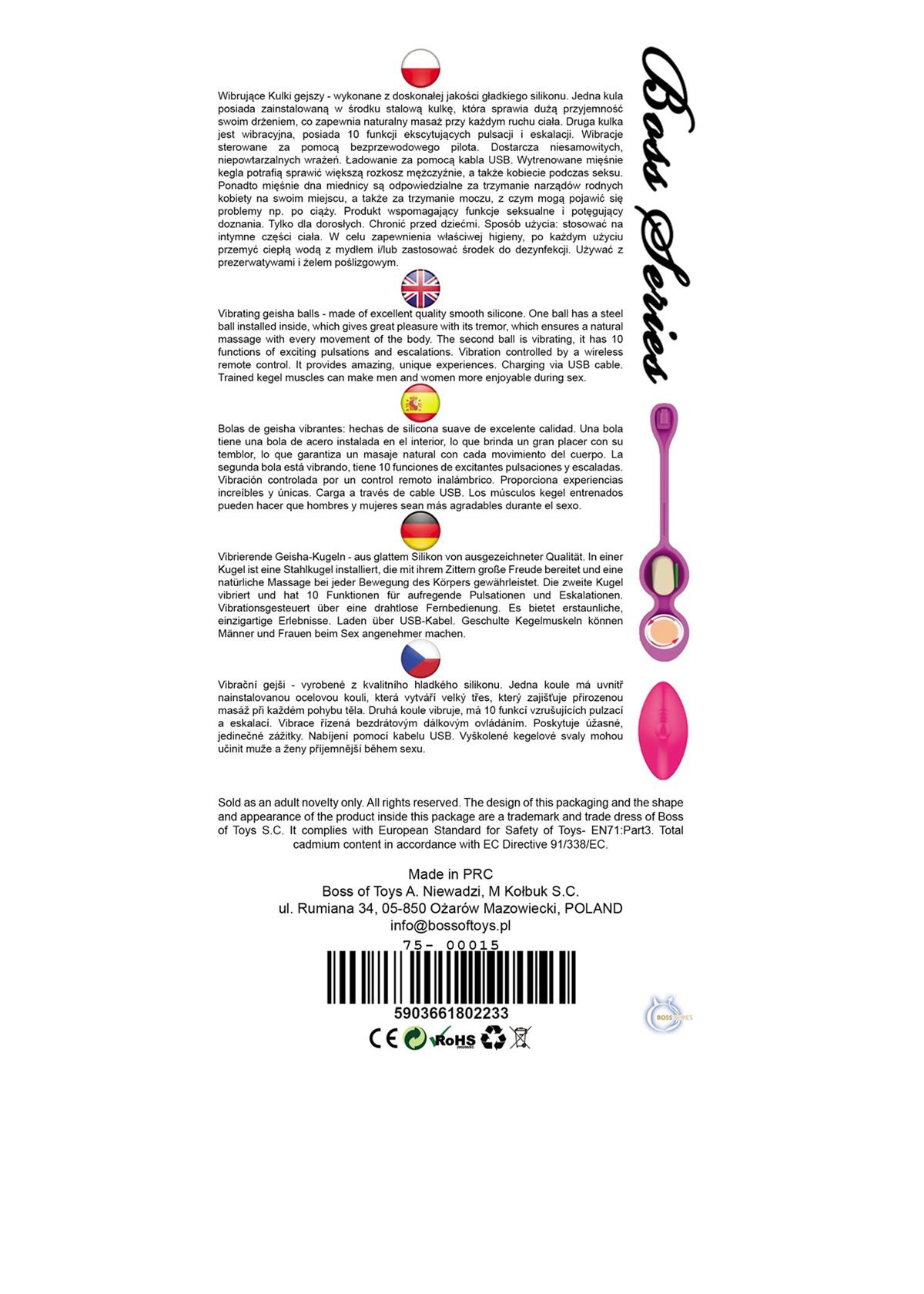 Bossoftoys - 75-00015 - Vibrating Kegel Balls - 32mm - 80g - Pink 10 function Remote Control - Rechargeable - Silicone Kegel Balls - strong blister