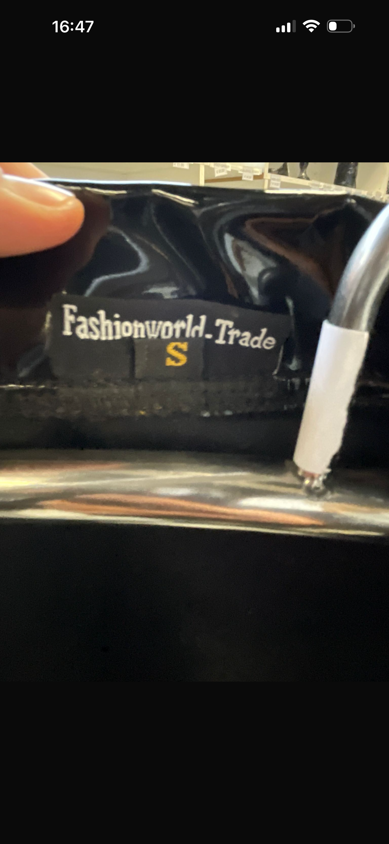 Bestel de FashionWorld glanzende zwarte middellange jas in maat S. Stoer kinky design met hoogglans finish en wit strepen logo. Ideaal voor alternatieve en fetish fashion.