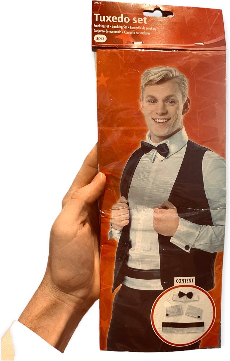 Stijlvol en veelzijdig design in meerdere kleuren: De Smoking Set is verkrijgbaar in een meerkleurig ontwerp, waardoor je kunt kiezen voor een stijl die perfect bij je persoonlijkheid en de gelegenheid past. Of je nu de voorkeur geeft aan een klassieke zwarte uitstraling, een opvallende kleuraccent wilt toevoegen of je wilt laten inspireren door thema's en kostuums, deze set biedt verschillende opties om je eigen unieke stijl te creëren.