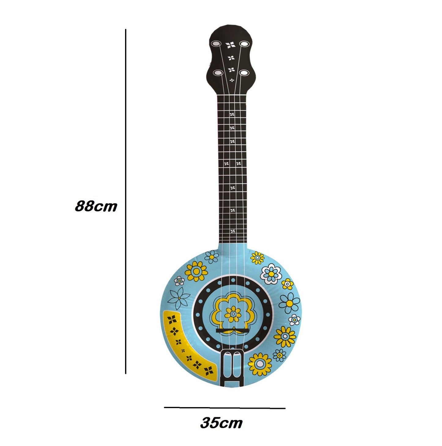 Opvallend formaat en speels design: Met een lengte van 88 cm valt deze opblaasbare banjo zeker op. Zijn opvallende formaat maakt hem zichtbaar voor iedereen, waardoor je de ster van het feest wordt. Het speelse design met de kenmerkende banjo-vorm en kleurrijke details voegt een vrolijke en feestelijke touch toe aan elke gelegenheid.