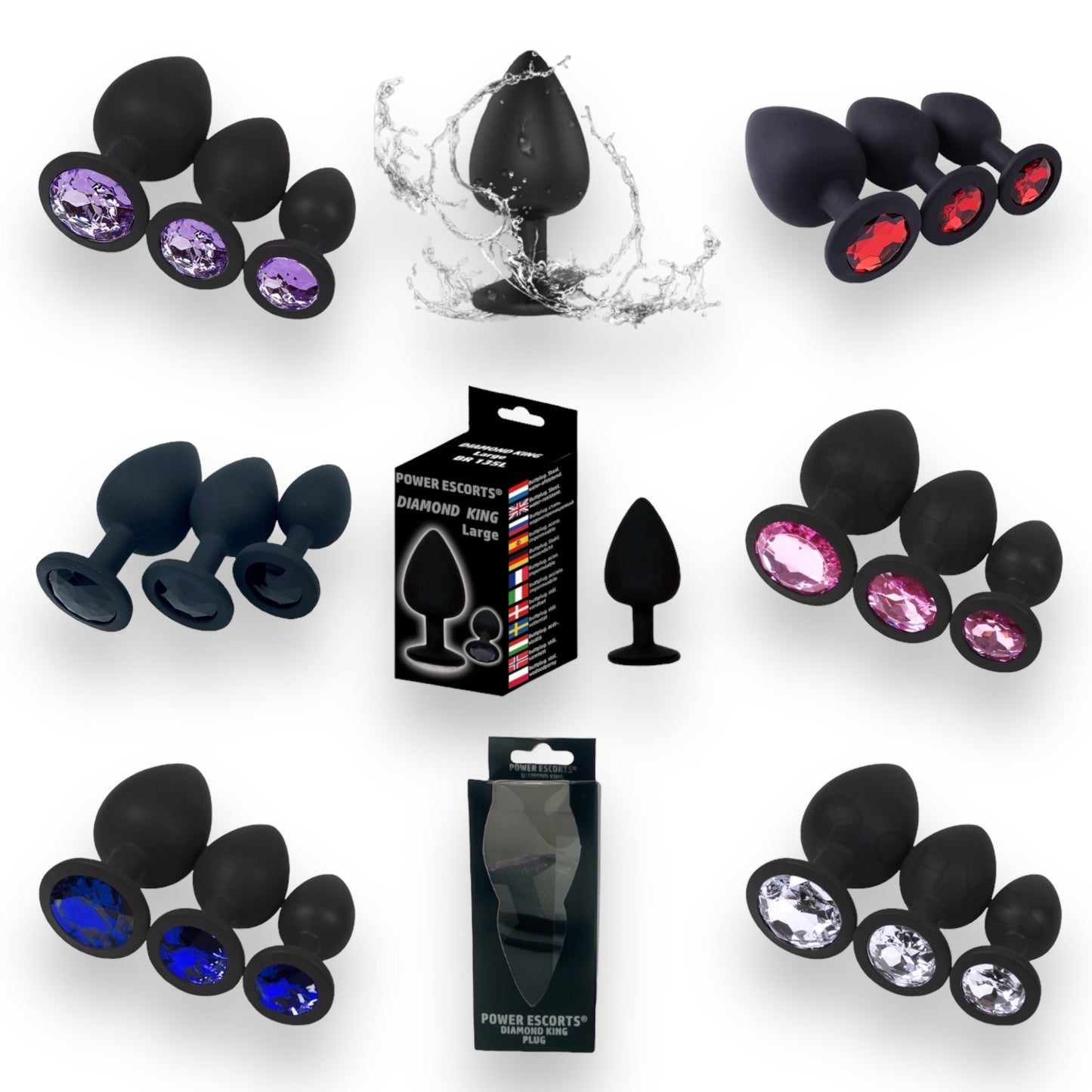 Power Escorts - BR135 - Diamond King - Silicone Butt Plug - Black - 6 Colours - 3 Sizes
