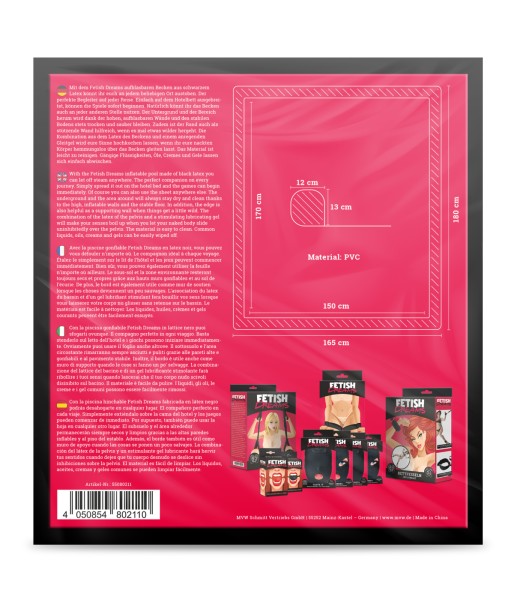 With the Fetish Dreams inflatable pool made of black PVC, you can let off steam anywhere. The perfect companion on every journey. Simply spread it out on the hotel bed and the games can begin immediately. Of course, you can also use the pool anywhere else. The ground and the area around will always stay dry and clean thanks to the high, inflatable walls and the stable floor. In addition, the edge is also helpful as a supporting wall when things get a little wild. The combination of latex in the pool and a stimulating lube will excite your senses as you let your naked body slide uninhibitedly over the pool. The material is easy to clean. Common liquids, oils, creams and gels can be easily wiped off.