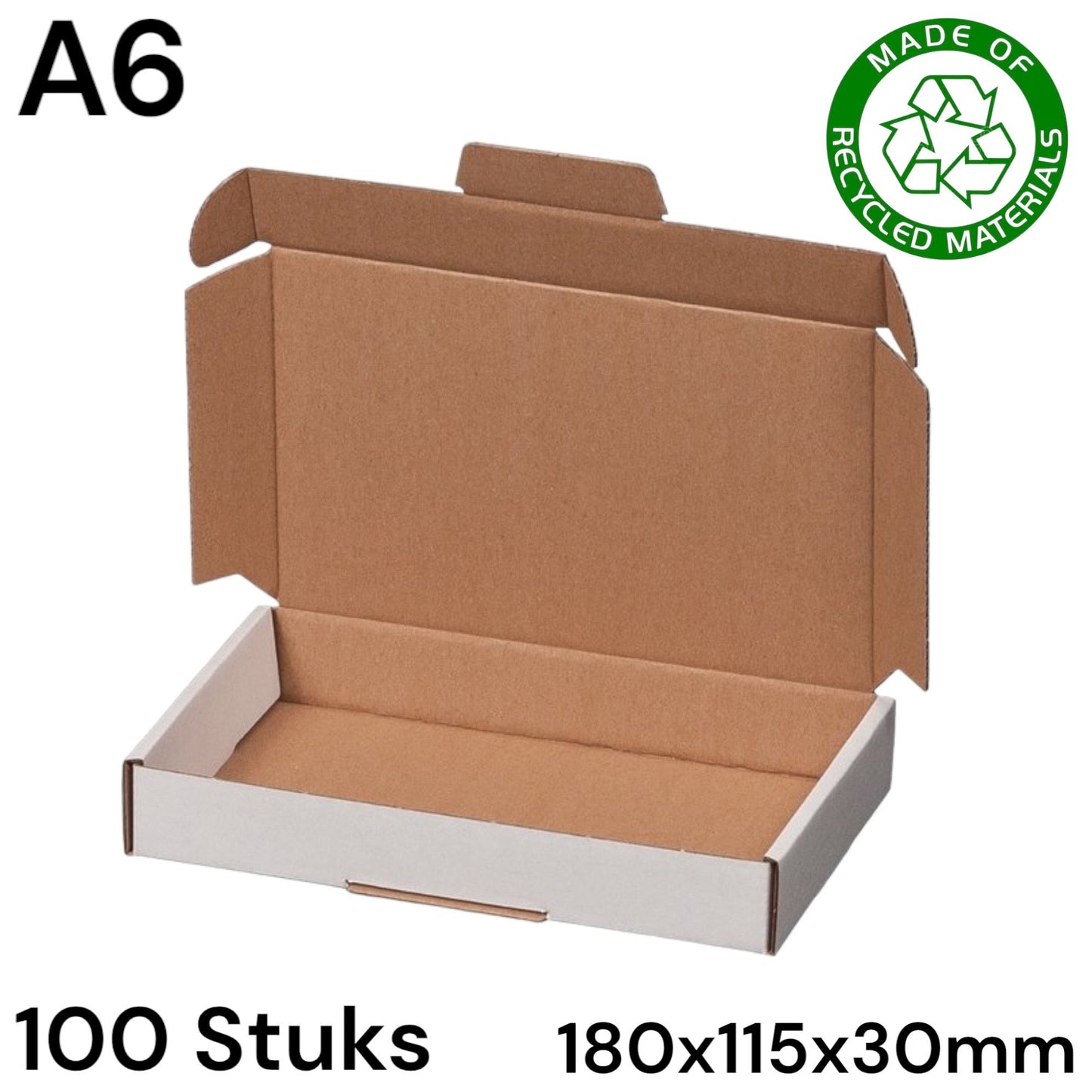 Deze doosjes zijn 100% gerecycled en goedgekeurd door Post NL, waardoor ze door elke brievenbus passen. Met een afmeting van 180 x 115 x 28 mm en een formaat van A6, zijn deze doosjes ideaal voor het verzenden van bijvoorbeeld brochures, flyers, of kleine accessoires.