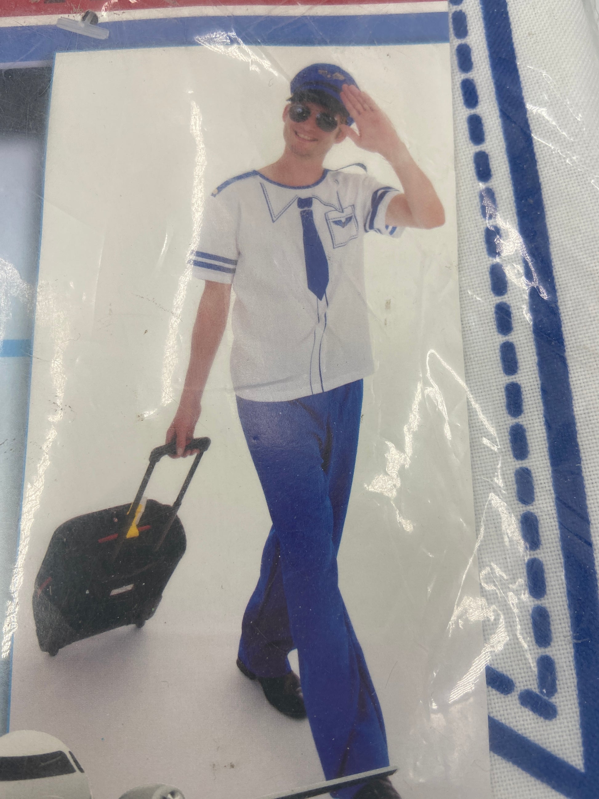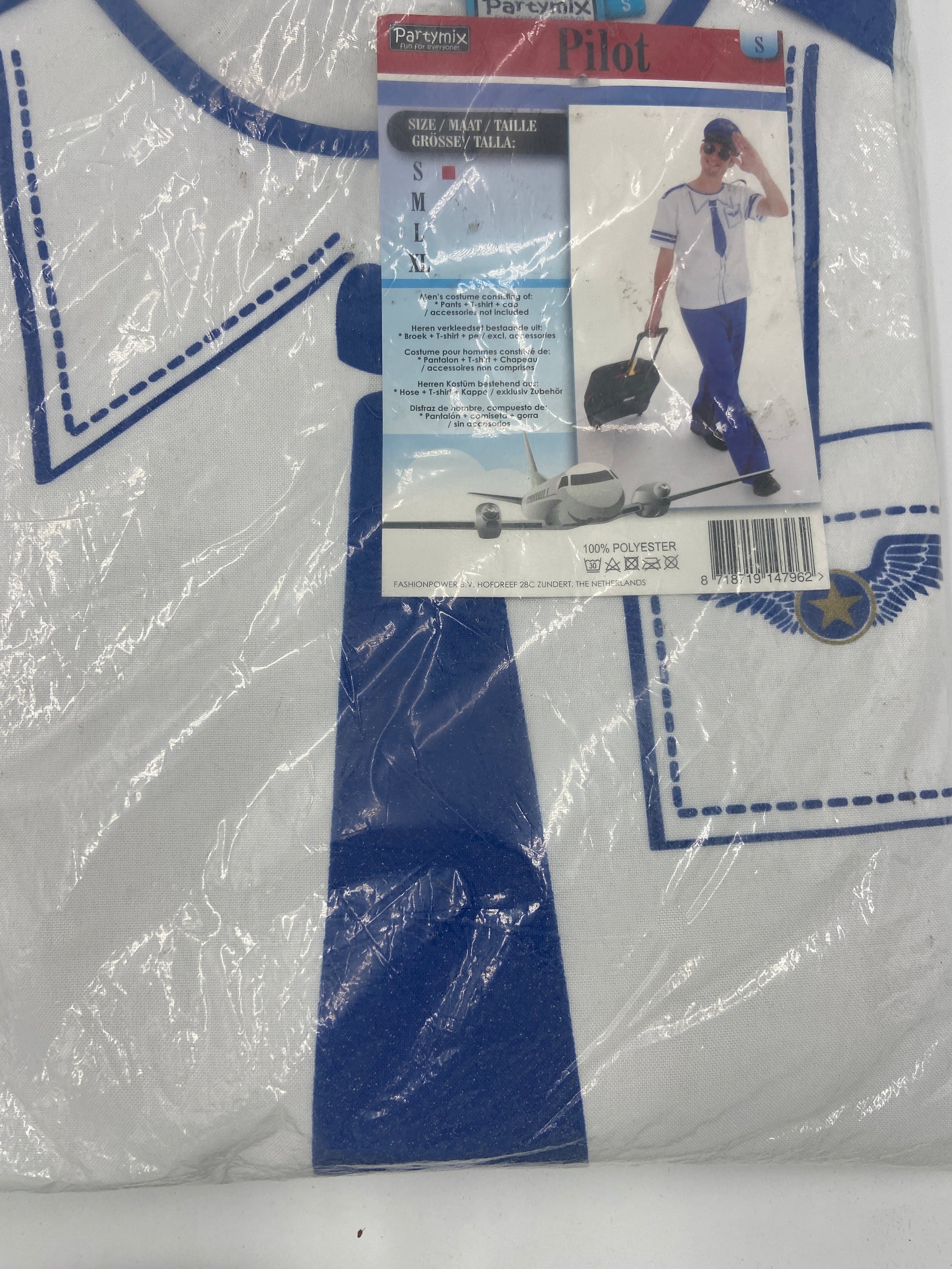 Inhoud: 1 wit/blauw piloten-shirt, 1 blauwe broek, 1 blauwe pilotenpet